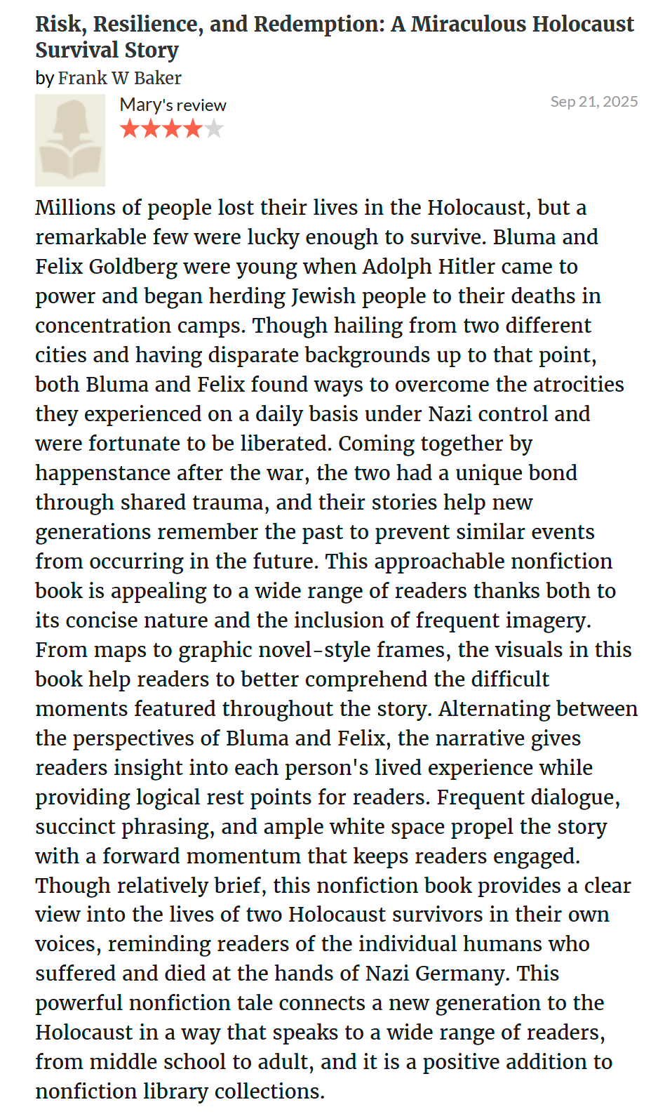 Author Frank Baker was interviewed by reviewer Mary Lanni for her podcast (Mary Lanni Reads) and she produced a video book review – September 26, 2025